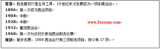 [作文地带写作提纲] 你很荣幸地成为2008北京奥运会的一名志愿者,负责编写奥运比赛项目的英语介绍。请根据以下中文提纲,编写射击项目的英语介绍: