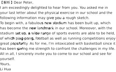 本篇书面表达属于英文书信,是很常见的考查写作能力的形式,写作难度不大。根据提示信息要求给英国朋友Peter回信,介绍学校的体育运动情况。
