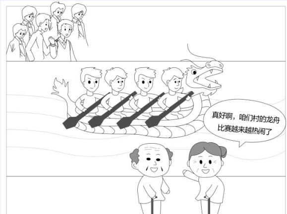 What comes into view is that in the picture, some young people are having a dragon boat race which attracts a lot of spectators. If we take a closer look, it can be found that an elderly woman said to her spouse happily, “It is wonderful that there are more and more people participating in the dragon boat race held in our village!” Obviously, the above picture has shown an implication that it is important to inherit and develop traditional culture.