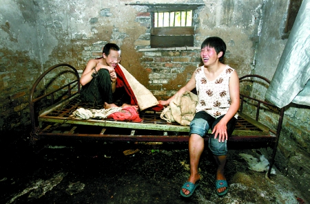 见有生人进屋,少年面露怯意,蜷缩着向窗边躲避,几缕阳光照在他苍白的脸上,他眼睛微闭,头部不时地抽搐,一根粗大的铁链子套在右手手腕上,另一头则栓在铁床上。