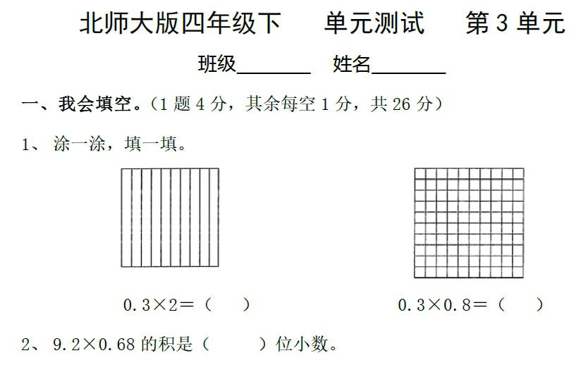 10、 一个长方形花坛的长是0.4 米,宽是0.3 米,它的面积是( )平方