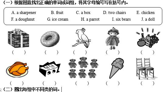 (一)根据图意找出正确的单词或词组,将其字母编号写在括号内。